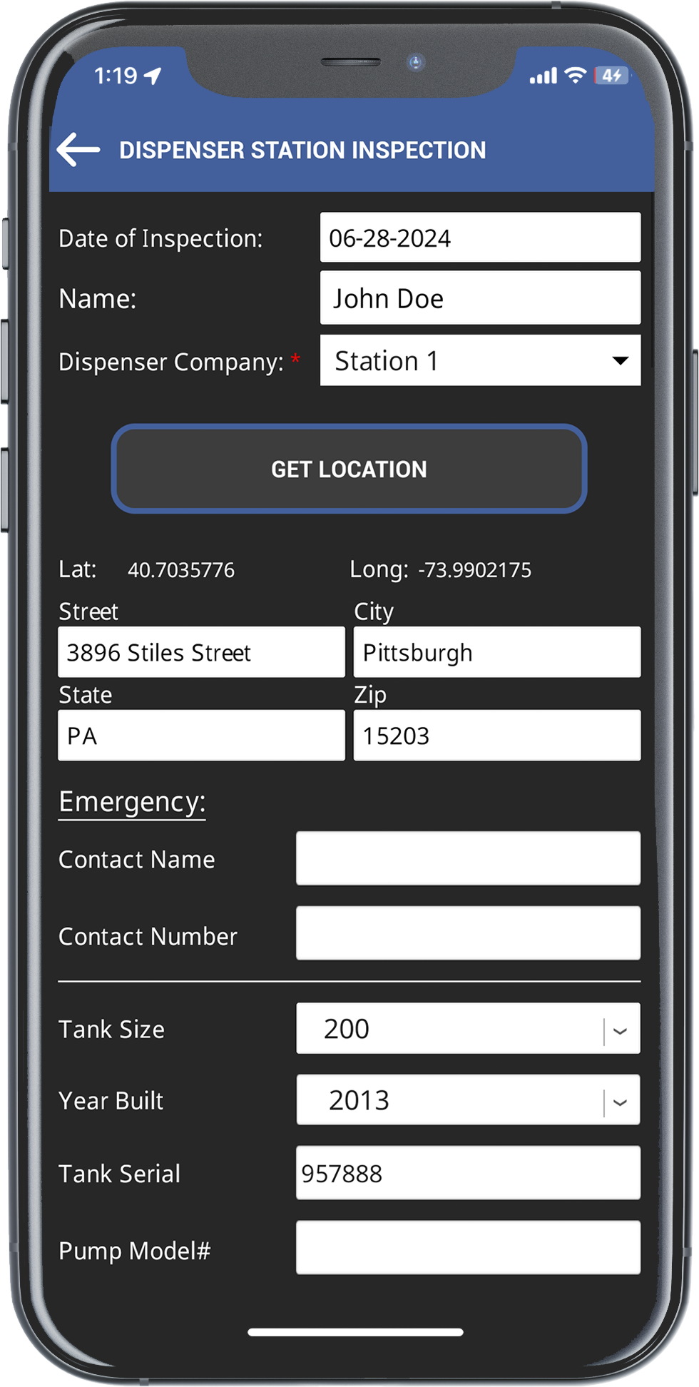 Complete digital inspection forms for dispenser stations — fast, accurate, paperless. GPS-stamped, time-stamped, photo-documented records.